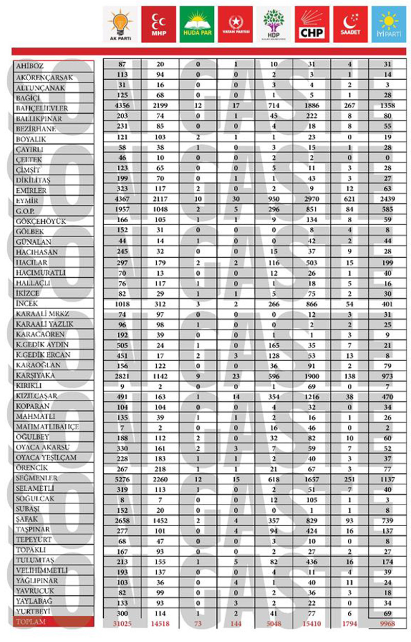 İşte Mahalle Mahalle milletvekilliği oy oranları;